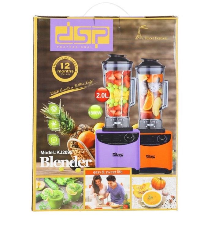 مخلوط کن حرفه ای دی اس پی KJ2099 با 1800 وات، تیغه 6 پره استیل، پارچ 2 لیتری و عملکرد پالس. مناسب برای اسموتی و خرد کردن یخ، حرفهای و خانگی.
