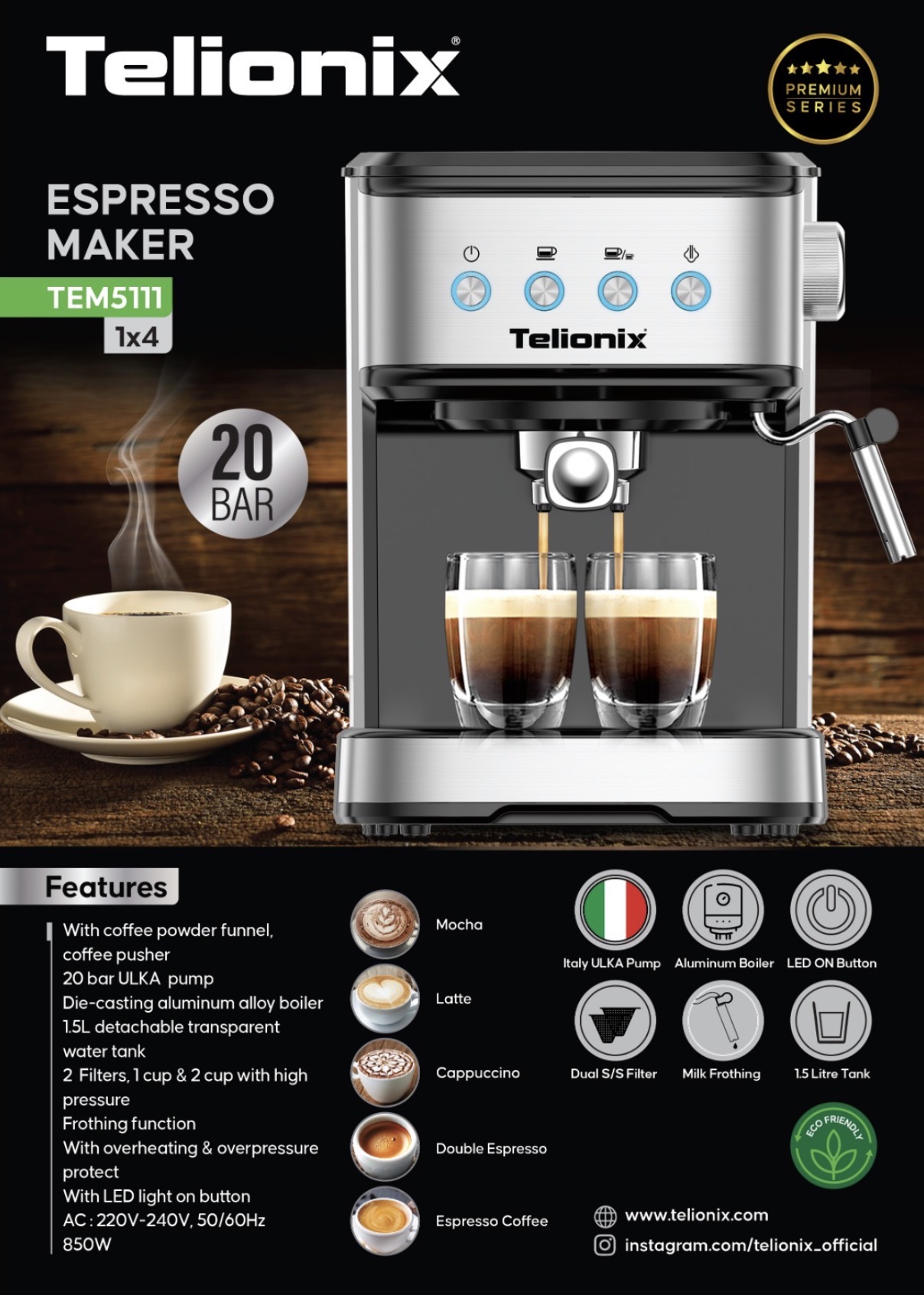 اسپرسوساز تلیونیکس مدل TEM5111 ظرفیت ۱.۵ لیتر با فیلتر استیل