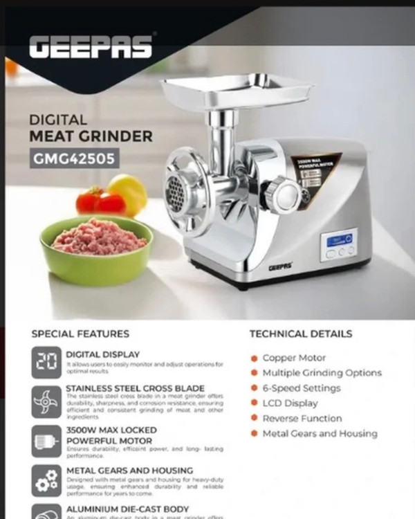 جدیدترین چرخ گوشت جیپاس مدل 42505 با موتور قدرتمند 3500 وات با بدنه تمام آلومینیومی و تیغه های تمام استیل با صفحه کنترل دیجیتال و موتور 6 سرعته با موتور گیربکس مناسب برای مصارف خانگی و تجاری با کیفیت عالی