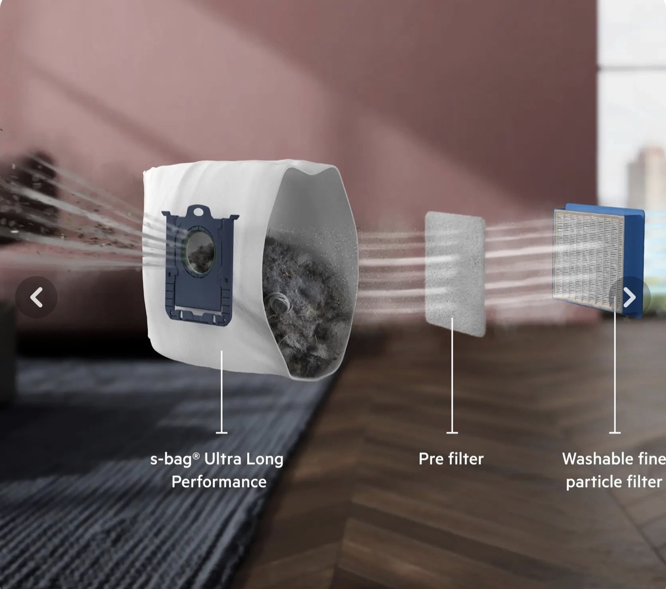 توانایی قرارگرفتن به صورت افقی و عمودی, جاروبرقی مناسب برای استفاده خانگی و معمولی, افراد آلرژیک (ضد آلرژی), حیوانات خانگی, دارای دستگیره ارگونومیک, دارای فیلتر قابل شستشو در زیر مخزن برای تمیز کردن هوای ورودی به موتور, دارای هشدار دهنده الکترونیکی تعویض کیسه گرد و غبار, دستگیره CleanLift جهت بیرون آوردن راحت کیسه با حداکثر بهداشت, دستگیره با طراحی ارگونومیک برای کنترل بهتر و راحتی بیشتر, فیلتر HEPA برای جذب ذرات ریز گرد و غبار از هوای خروجی جاروبرقی مخصوص افراد آلرژیک با قابلیت شستشو, قابلیت مخصوص نگهداری لوله خرطومی روی بدنه جاروبرقی, لوله تلسکوپی با قفل کشویی و ضامنی, نازل اصلی با قابلیت تنظیم در 2 حالت برای تمیز کردن سطوح صاف و کف زمین